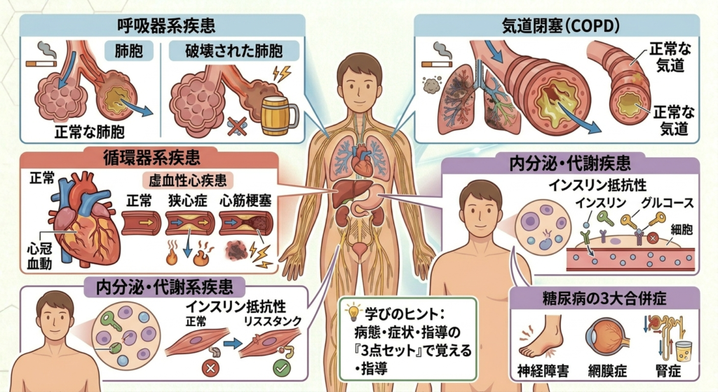 - 糖尿病: インスリンの不足で血糖値が上がる病気。「喉が渇く(口渇)」「多尿」が初期症状。3大合併症は「し・め・じ(神経・目・腎臓)」。