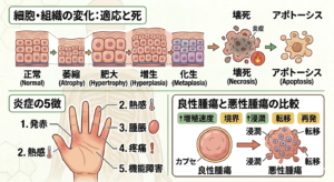 - 心不全: 心臓のポンプ機能が低下し、全身に血液を送れなくなった状態。「むくみ(浮腫)」や「息切れ(起坐呼吸)」に注意。