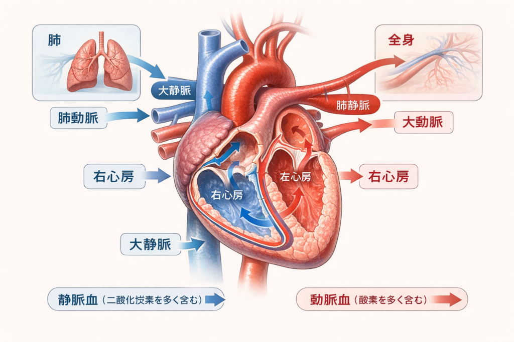 心臓は4つの部屋に分かれています。全身から戻ってきた静脈血が最初に入るのは右心房であり、肺へ送られる血液が通る血管を肺動脈といいます。